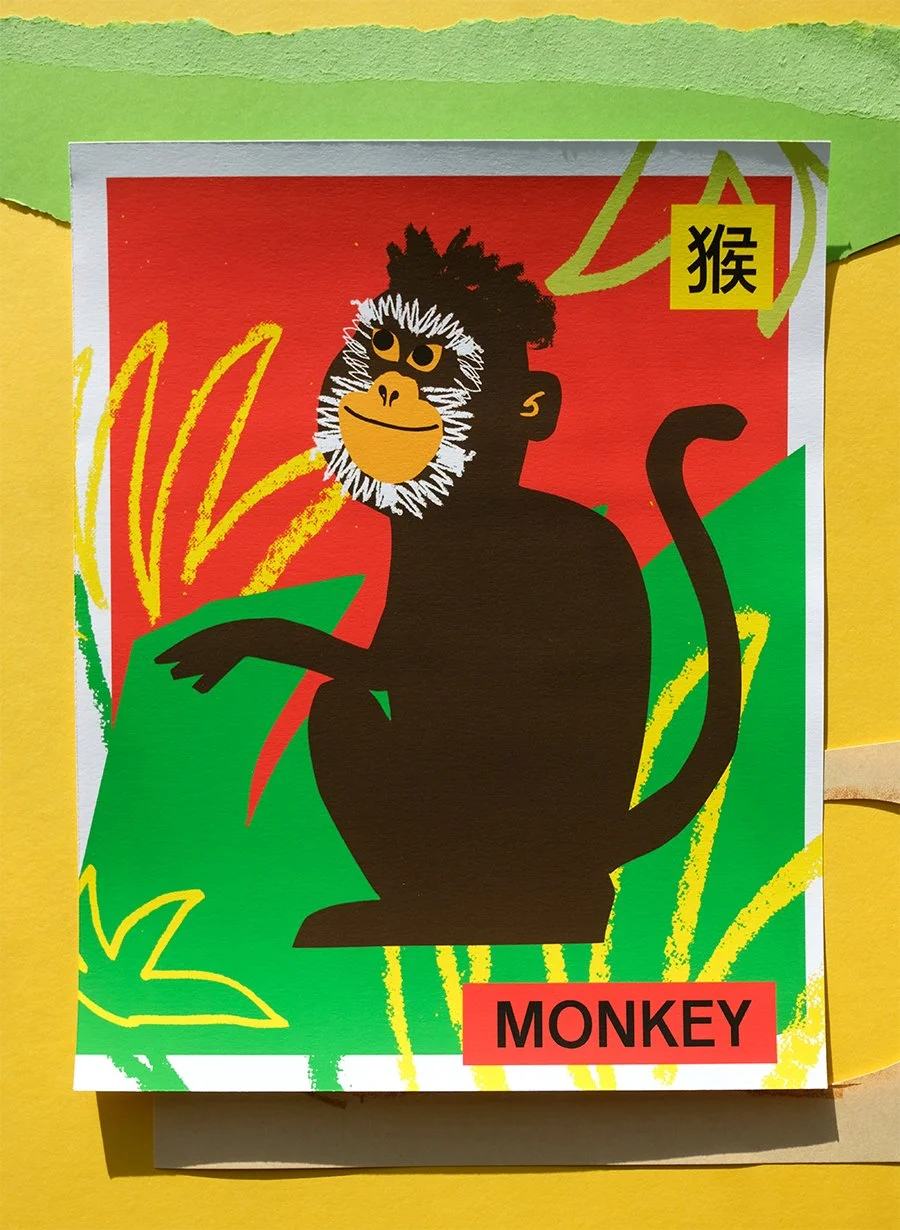 Portraits of the Lunar New Year animals according to the Chinese Zodiac. Mixed media with cut paper.
